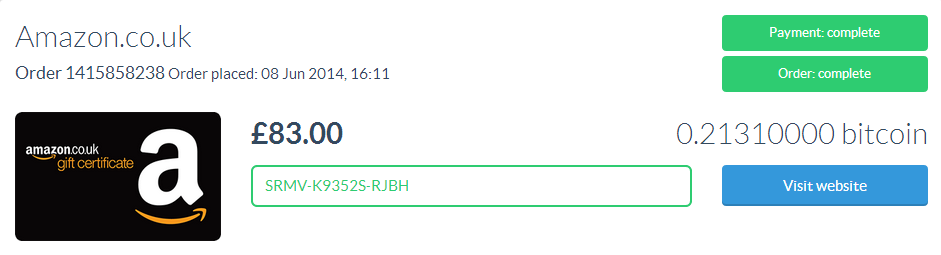 All went smoothly, though. Your purchase appears on your dashboard page immediately, with a couple of status icons to let you know how your order is progressing — along with a couple of email updates along the way. Once the payment had been confirmed by the network, everything turned green and within about 10 minutes of this the Amazon voucher code was displayed for me to go and enter into my Amazon account.