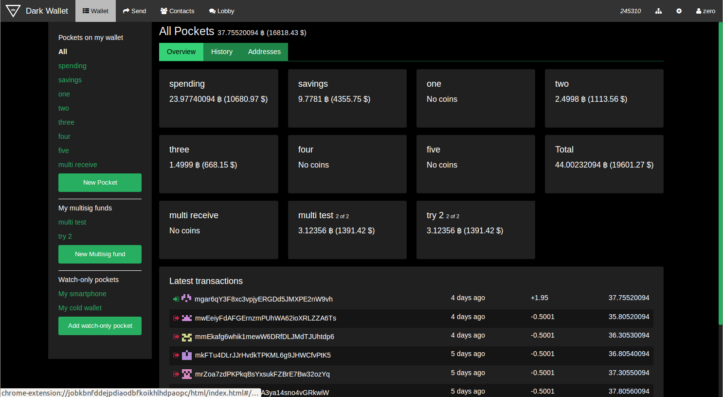 1. Click on “Wallet” and select an existing pocket or make a new one. Now click on Overview and copy the stealth address. Find your way to the Dark Wallet lobby, select the Trollnet channel and ask if anyone there will send you some testcoin. Paste the stealth address into the chat channel. Most of the time, that works. Also, while exploring the Lobby, I advise that you collect some testing partners if you are motivated to explore the more advanced features. Or if you are less experienced offer to work with one of the more skilled testers. To test and play with multisig funds, for example, you’ll need a team of three or more! If someone sends you coin, go watch the transaction mature at Wallet->All->History->Last 10.