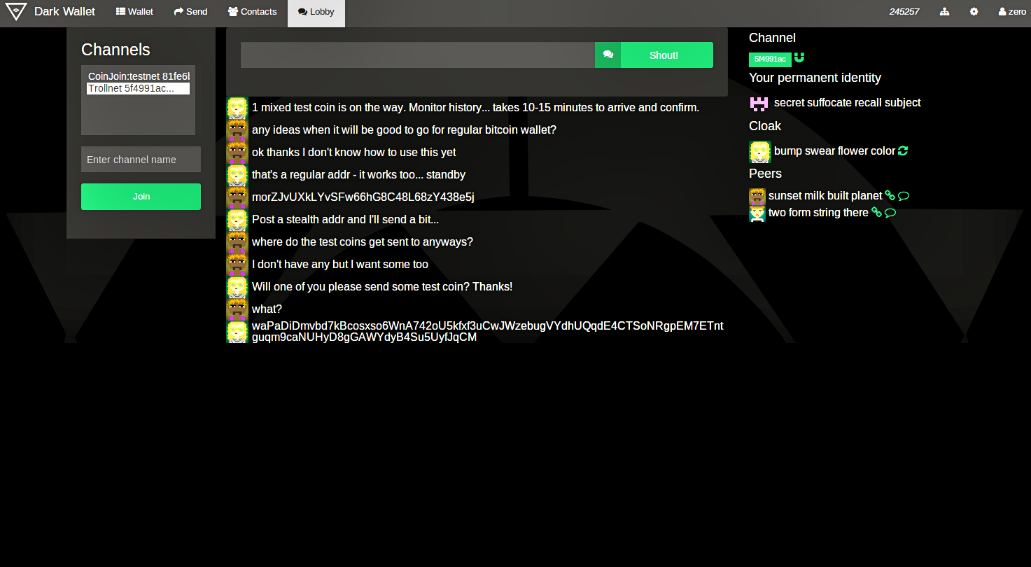 egrated into Dark Wallet. My perspective is that the contributions of the Dark Wallet lobby are, in itself, noteworthy and particularly valuable given the nature of Dark Wallet and the sensibilities of its users. The integral lobby provides several advancements that I will attempt to cover here. Locate the Channels menu where you should select Trollnet if you want to contribute to or monitor the communications.