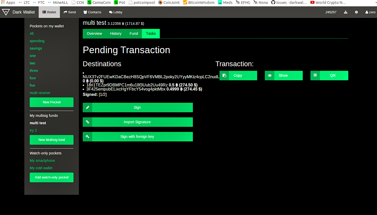 In alpha3, the potent multisig funds feature has been enabled. One easily creates a multisig fund by specifying the fund managers from Contacts and how many signatures are required to spend. Fund mangers sign or deny sends from their “Tasks” tab of the shared multisig fund pocket. Payments are put on hold until the proper number of signatures are provided by the fund managers.